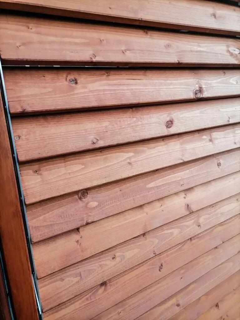 Zbliżenie na drewniane panele żaluzjowe w pergoli pokazuje staranne wykonanie i trwałość materiału. Odpowiednie ułożenie listew pozwala na częściowe zacienienie tarasu i ochronę przed wiatrem.