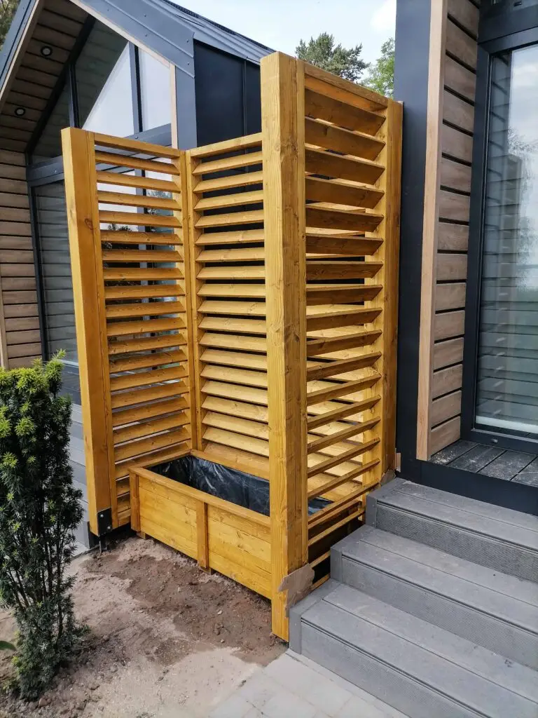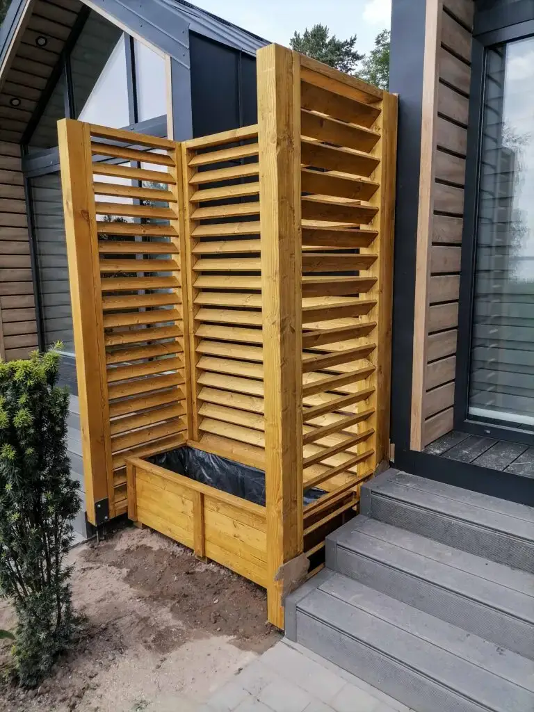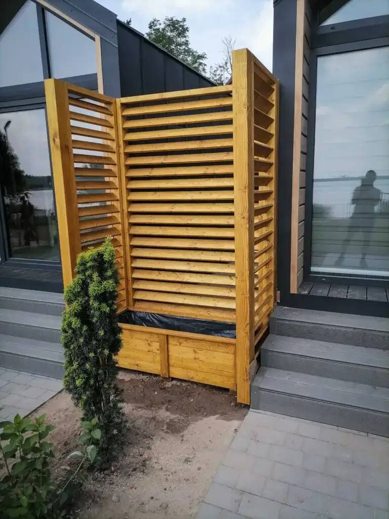 Funkcjonalna drewniana zabudowa tarasu zintegrowana z donicą. Ażurowe lamele zapewniają prywatność, a jednocześnie nadają lekkości i naturalnego charakteru przestrzeni.