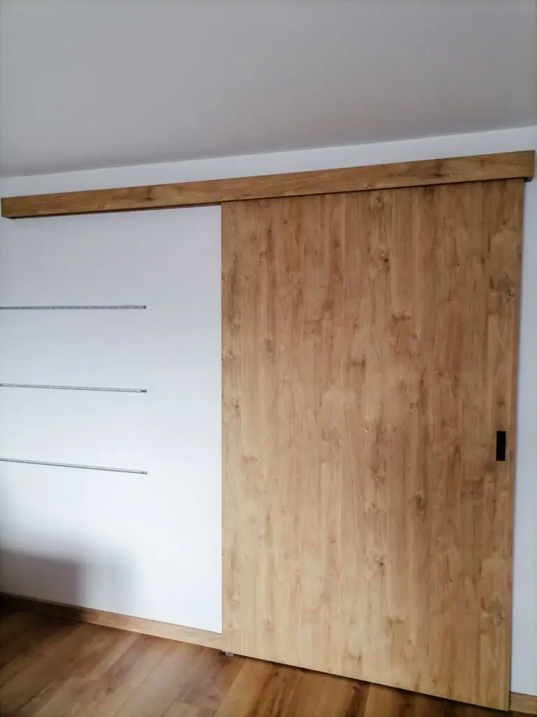 Drzwi przesuwne z płyty w dekorze dębu, prowadzone po listwie z maskownicą, to wygodny sposób na oddzielenie stref w domu. Zajmują mało miejsca i dobrze współgrają z drewnianą podłogą oraz jasnymi ścianami.