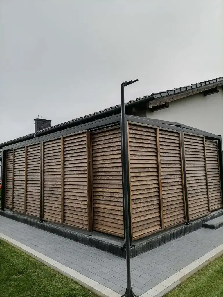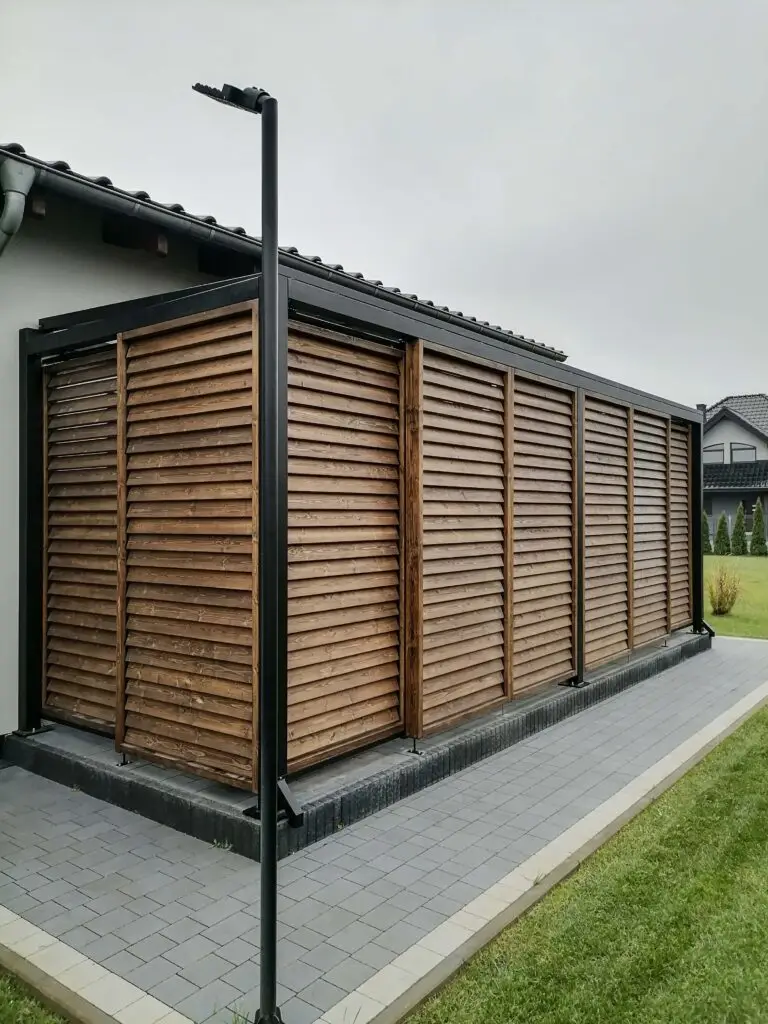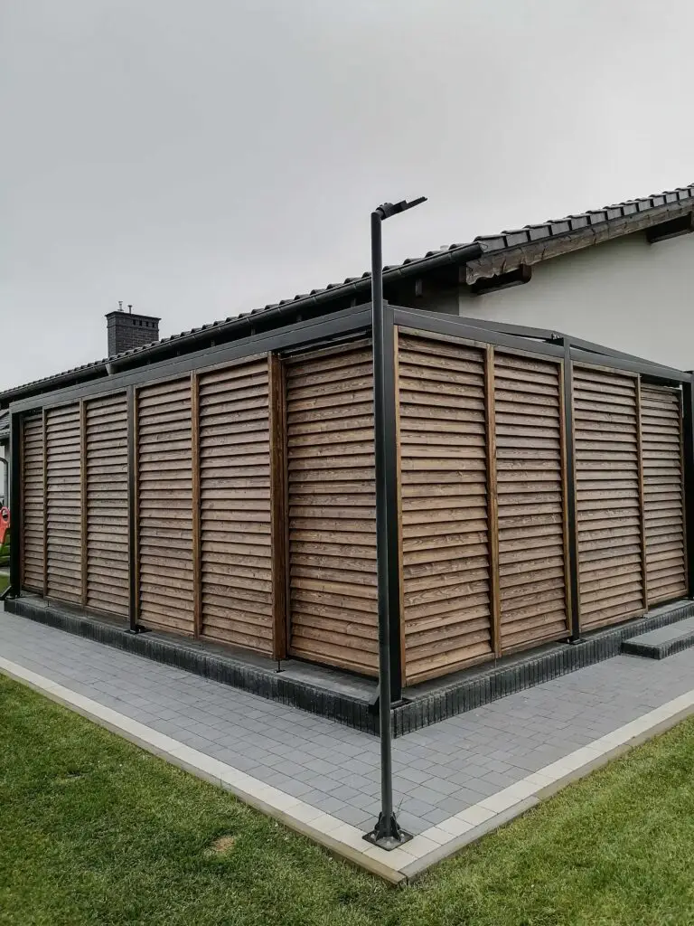 Zabudowa ogrodowa z drewnianymi panelami żaluzjowymi to elegancki sposób na wydzielenie przestrzeni i osłonięcie się od wiatru czy słońca. Naturalne drewno dodaje ciepła i przytulnego charakteru całej aranżacji.