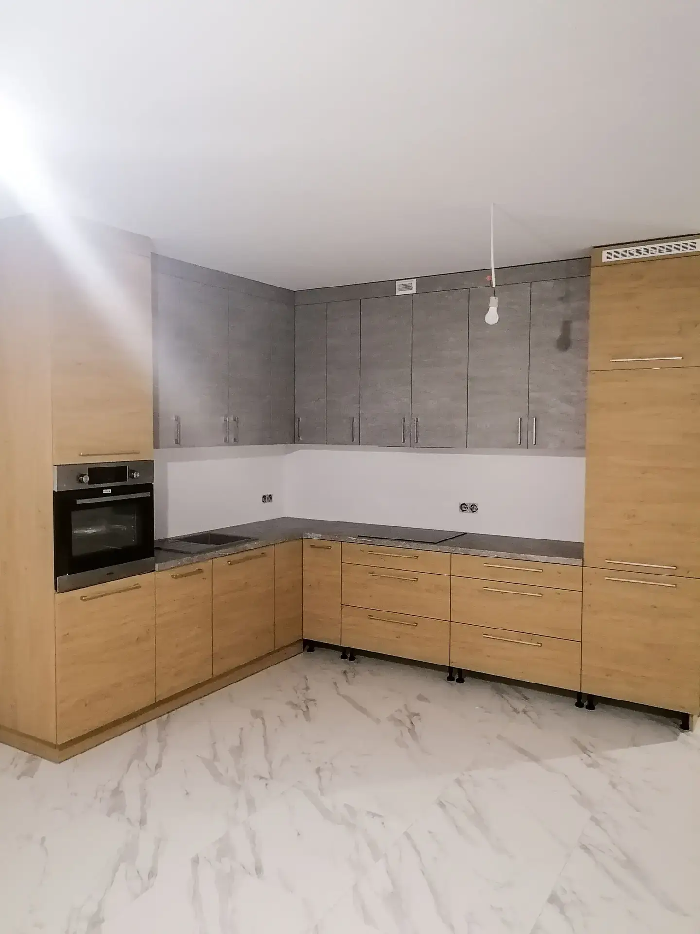 Kuchnia łączy dolne fronty w naturalnym drewnie z górnymi w odcieniach szarości. Kontrast wykończeń podkreśla nowoczesny charakter i porządkuje strefy pracy.