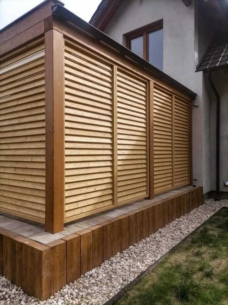 Pergola drewniana z ruchomymi lamelami zapewnia komfort wypoczynku na tarasie i pozwala kontrolować ilość światła. Solidne wykonanie sprawia, że konstrukcja jest estetyczna i trwała.