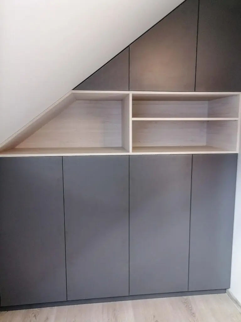 Szafa pod skosem w ciemnym macie Zabudowa wykonana pod wymiar skosu to idealny przykład efektywnego wykorzystania przestrzeni. Grafitowe fronty w macie zestawione z jasnym wnętrzem tworzą nowoczesny kontrast i elegancki efekt. Precyzyjna praca warsztatu stolarskiego w Wolsztynie.