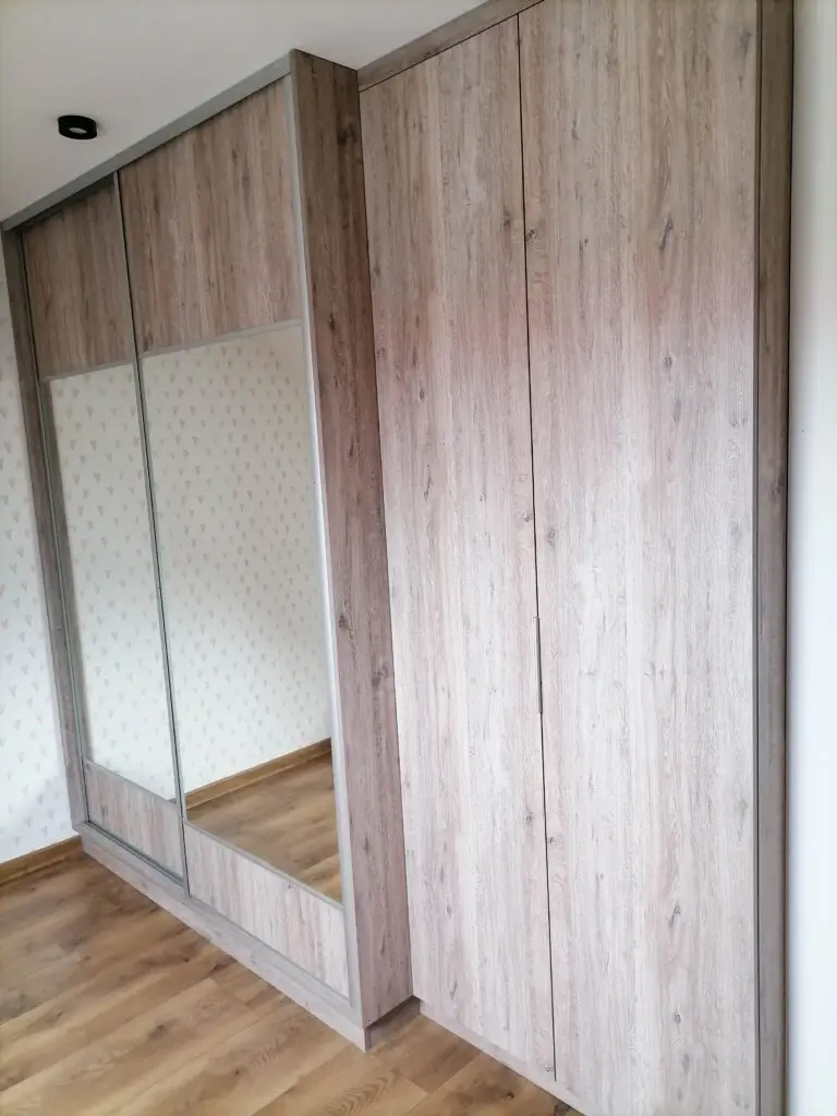 Funkcjonalna zabudowa łączy szafę z frontami na zawiasach oraz część przesuwną z dużym lustrem. Utrzymana w odcieniu jasnego drewna, optycznie powiększa przestrzeń i wprowadza do niej ciepło.