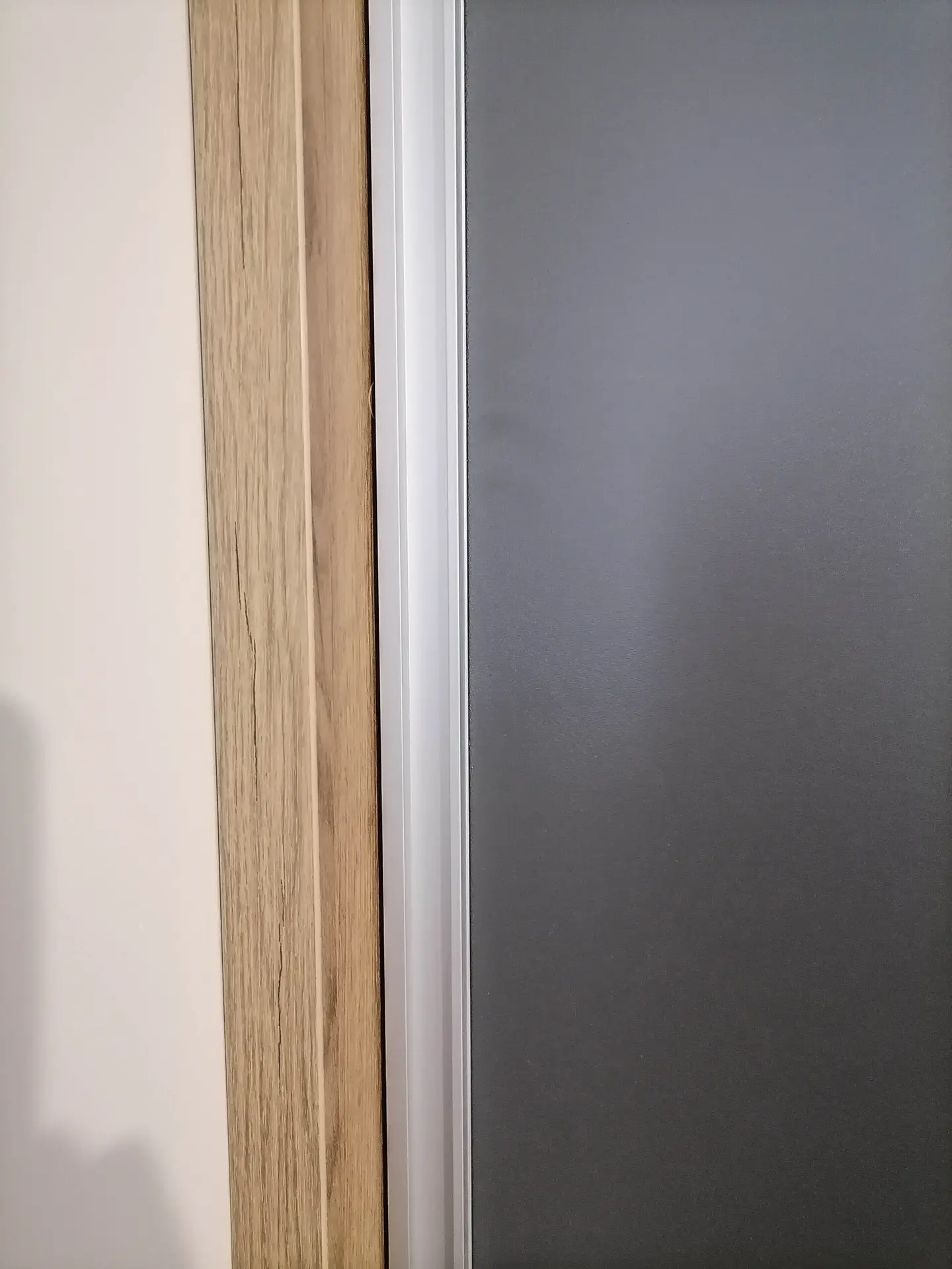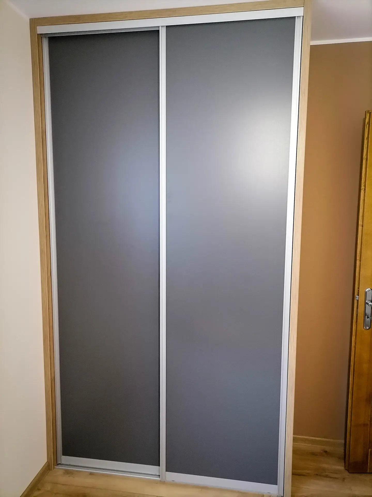 Zamykana szafa z pełnymi, gładkimi frontami w neutralnej kolorystyce. Równy rytm podziałów drzwi podkreśla minimalistyczny charakter zabudowy.