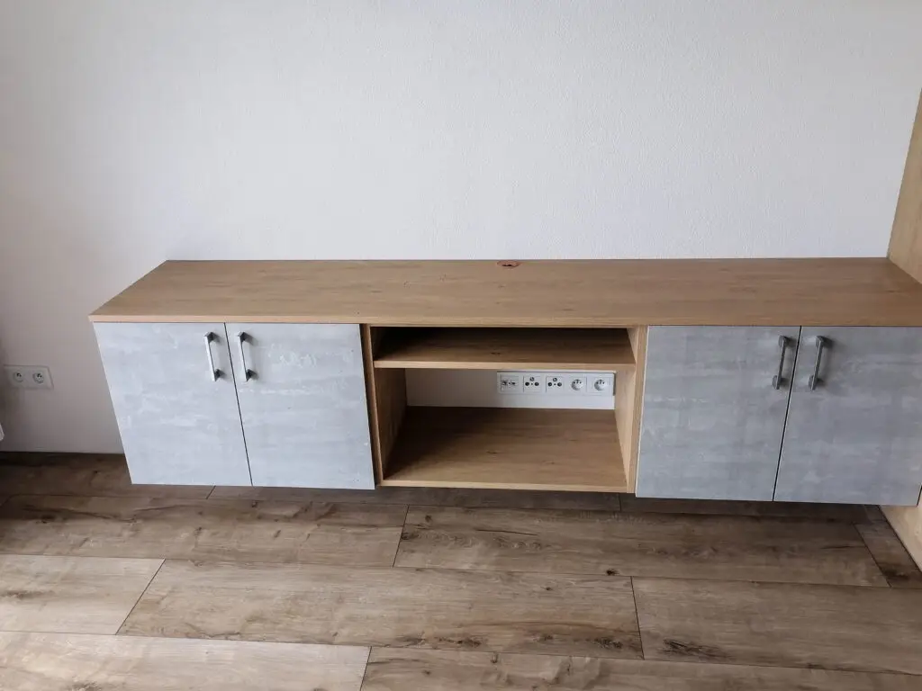 Nowoczesna szafka RTV wykonana z połączenia drewna i płyt w szarym wykończeniu. Prosta, geometryczna forma doskonale sprawdzi się w nowoczesnych salonach.