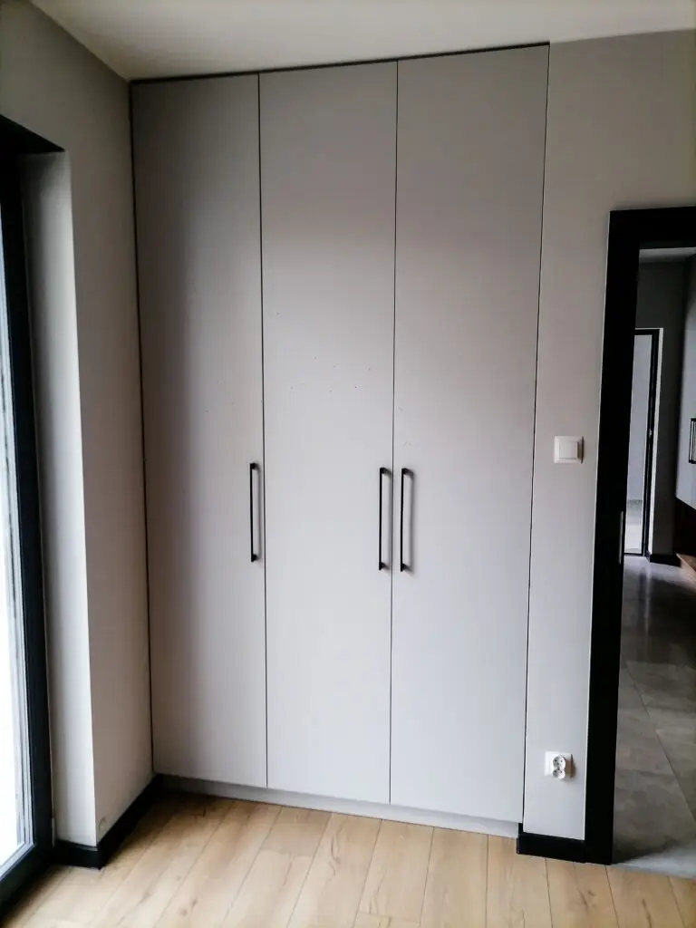 Szafa wykonana w matowym odcieniu szarości to połączenie prostoty i elegancji. Czarne, pionowe uchwyty dodają jej charakteru i nowoczesnego wyglądu, tworząc spójną zabudowę w jasnym wnętrzu.
