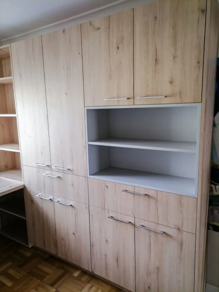 Funkcjonalna zabudowa biurowa z naturalnymi frontami w odcieniu dębu. Otwarta półka na środku nadaje lekkości, a całość zapewnia dużo miejsca do przechowywania. Meble idealne do domowego biura lub gabinetu.