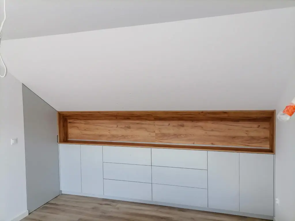 Funkcjonalna zabudowa pod skosem z szeroką wnęką w dekorze drewna. Jasne fronty i naturalny odcień półek tworzą estetyczną i praktyczną przestrzeń do przechowywania.