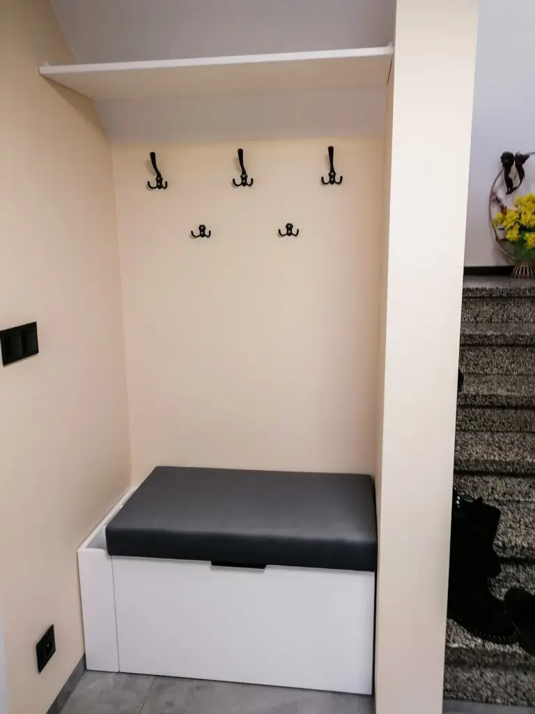 Funkcjonalna zabudowa do przedpokoju z tapicerowanym siedziskiem i wieszakami to praktyczne uzupełnienie domowej przestrzeni. Wygodne miejsce do siedzenia i przechowywania sprawia, że codzienne korzystanie z przedpokoju jest komfortowe.